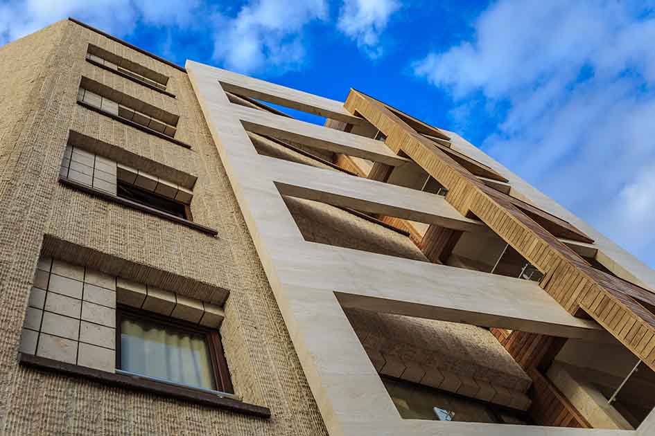 این ساختمان مسکونی چهار طبقه با رویکردی مدرن و مینیمال طراحی شده و از ترکیب متریالهایی چون سنگ و چوب در نمای خود بهره میبرد. یکی از شاخصترین ویژگیهای آن، فرمی است که بهصورت یک پوسته دوم روی نمای اصلی قرار گرفته و مانند قابی مستقل، ساختار معماری ساختمان را برجسته میکند.